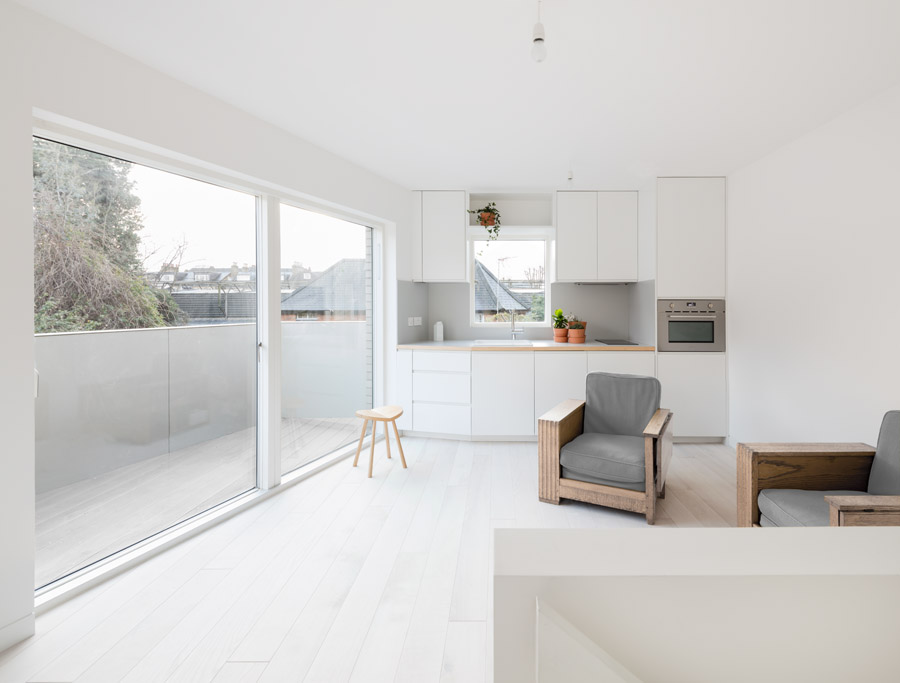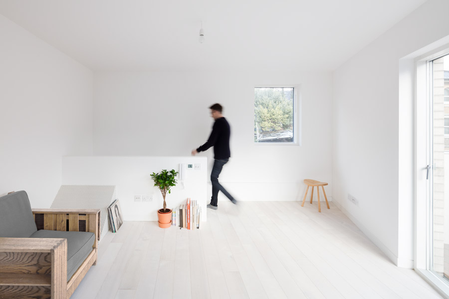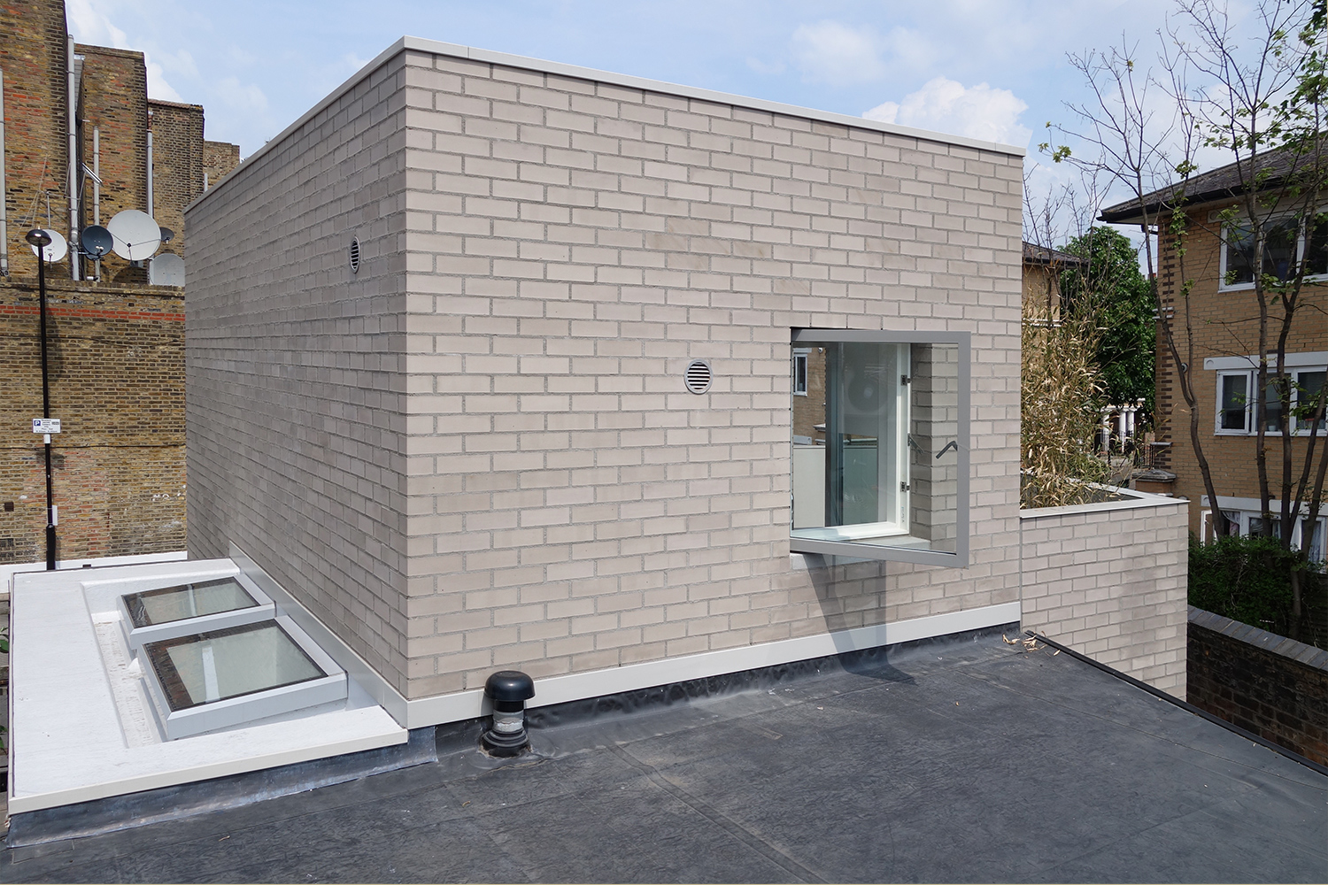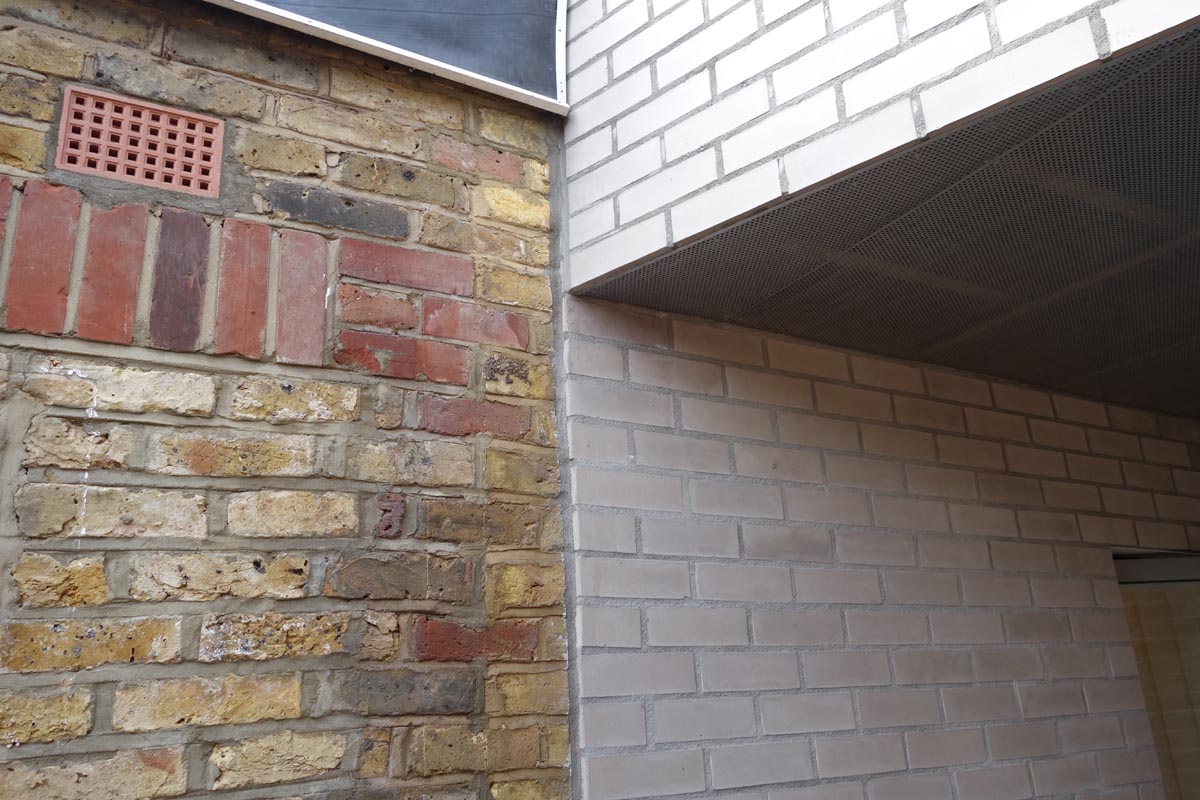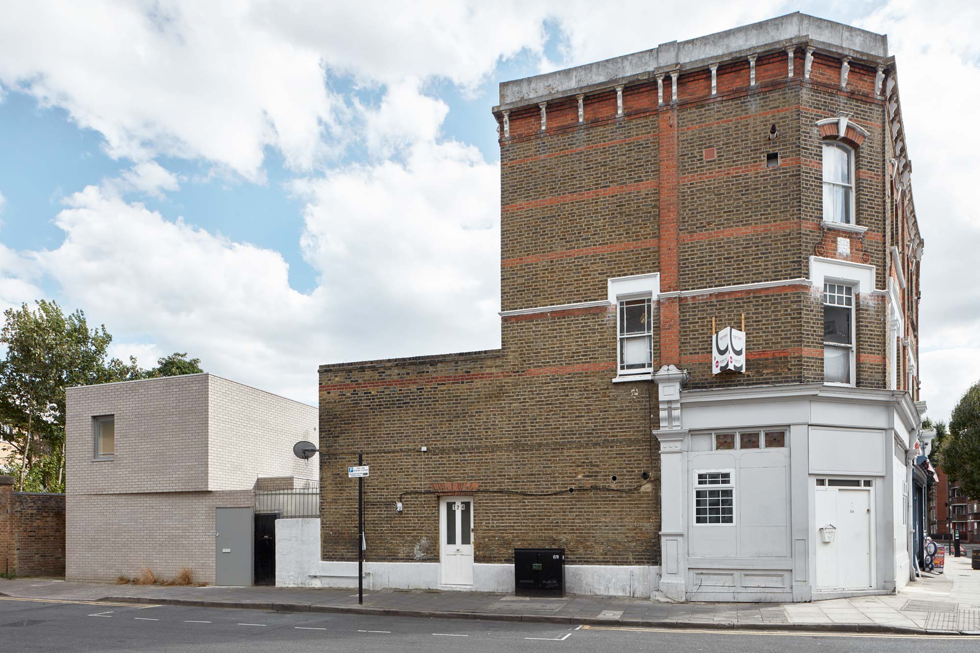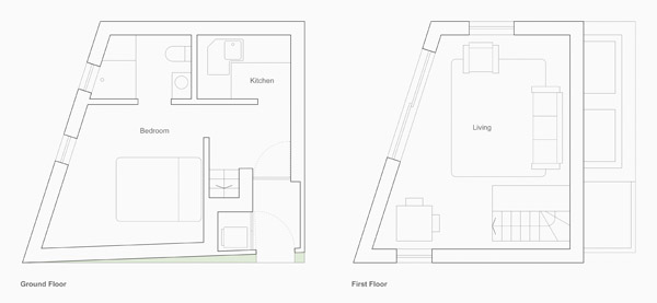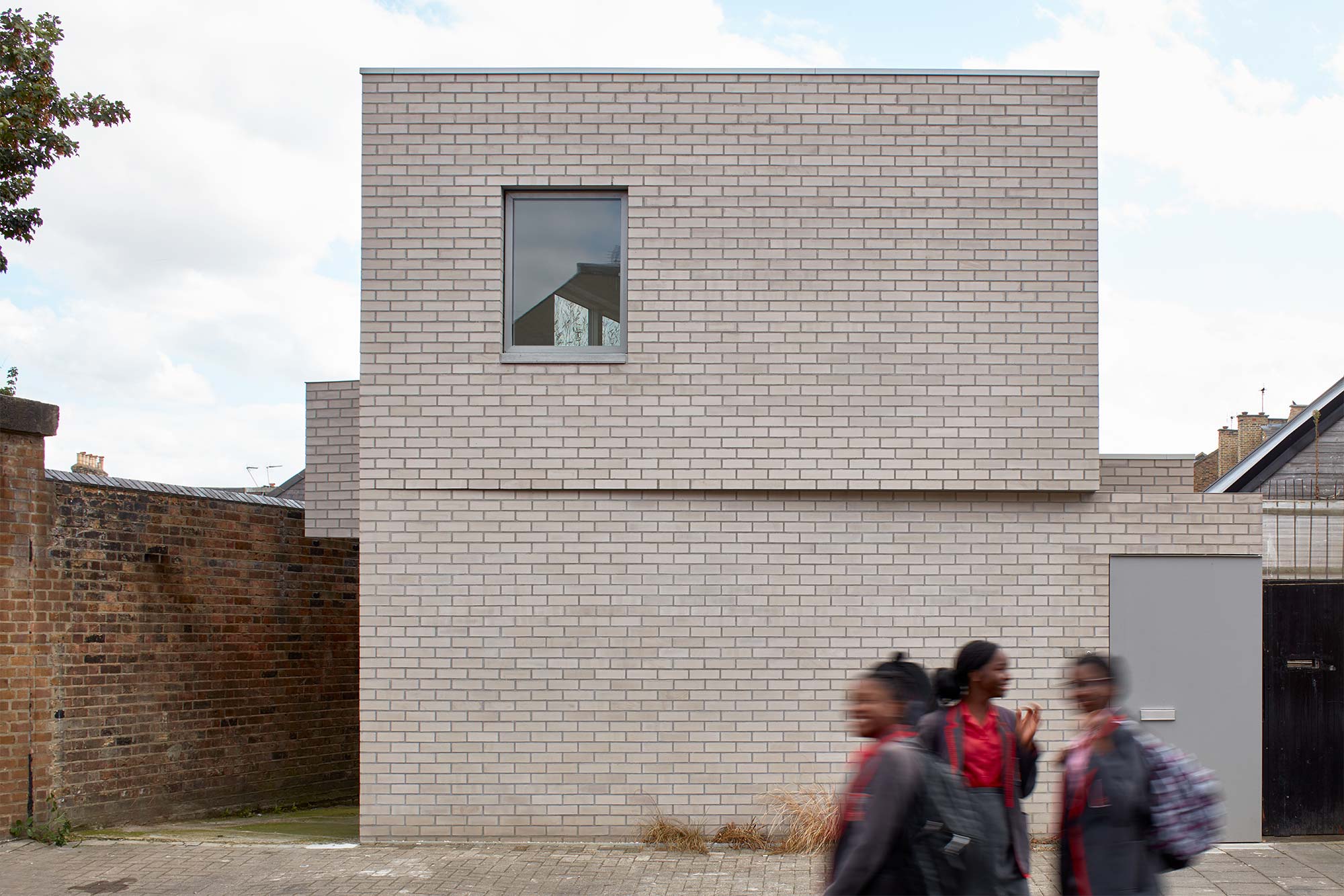 At ground floor level the simple brick front elevation wall tapers and offers back a thin wedge of garden to the street, suggestive of the domesticity beyond its defensive shell. Behind the concealed street door hides the smallest of courtyards leading to an entrance, bedroom, bathroom and kitchen. Elevated above street level, the first floor is reserved for the main living space with views overlooking the chaotic yards of the adjacent terrace, the streetscape and the more tranquil gardens of the of what used to be the Mothers' Hospital.