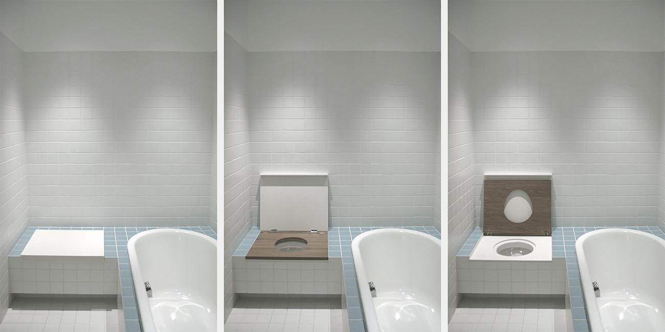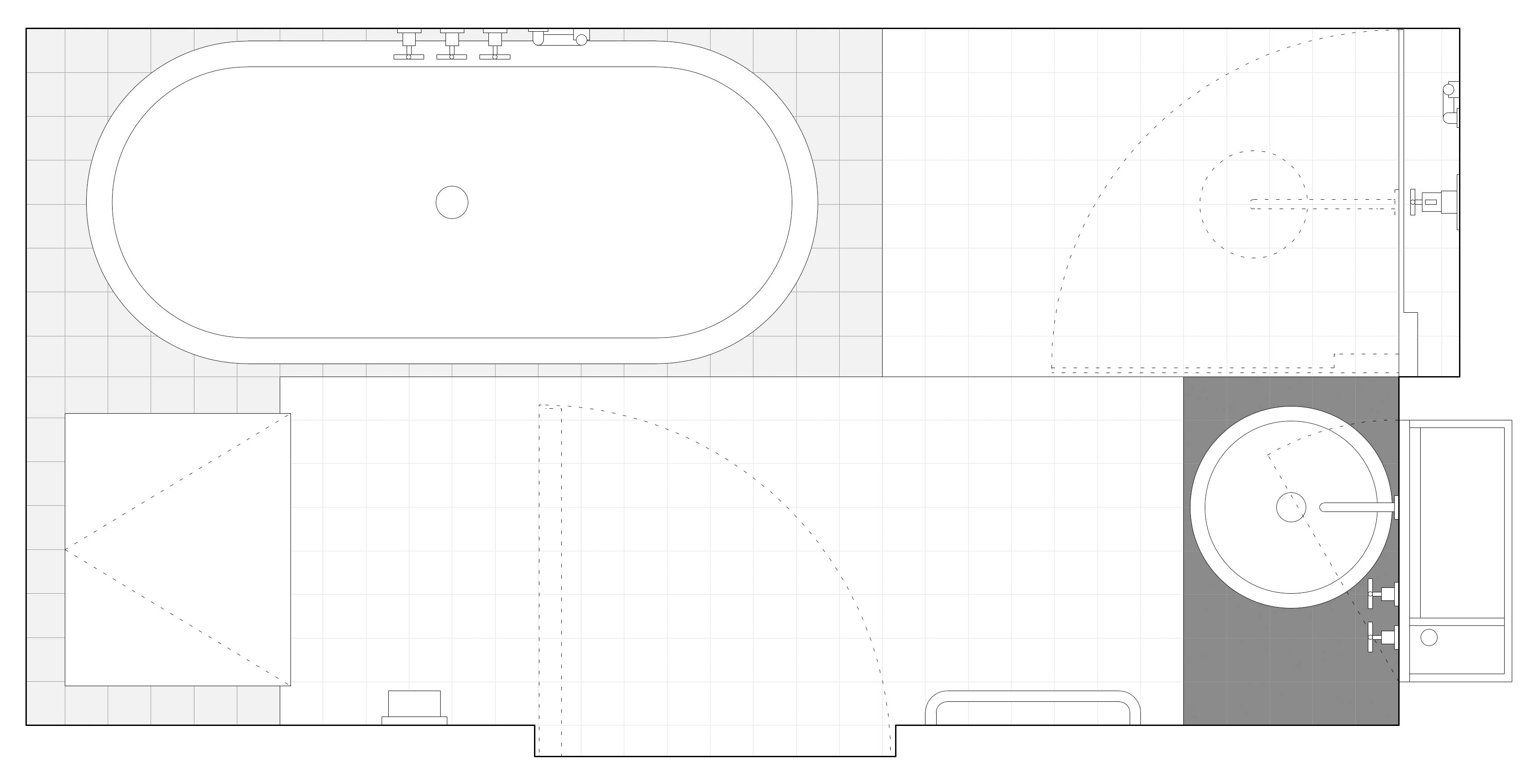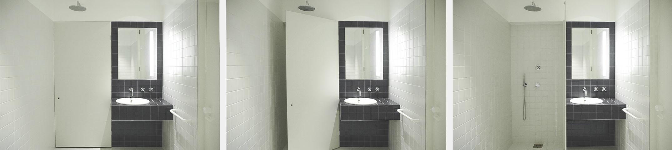The compact bathroom has a Corian door that sits flush in the wall adjacent to the wash hand basin. When opened it reveals the shower controls and the door becomes the shower screen. Similarly, due to its proximity with the bath, the WC pan is built into and concealed by an extension of the bath surround.