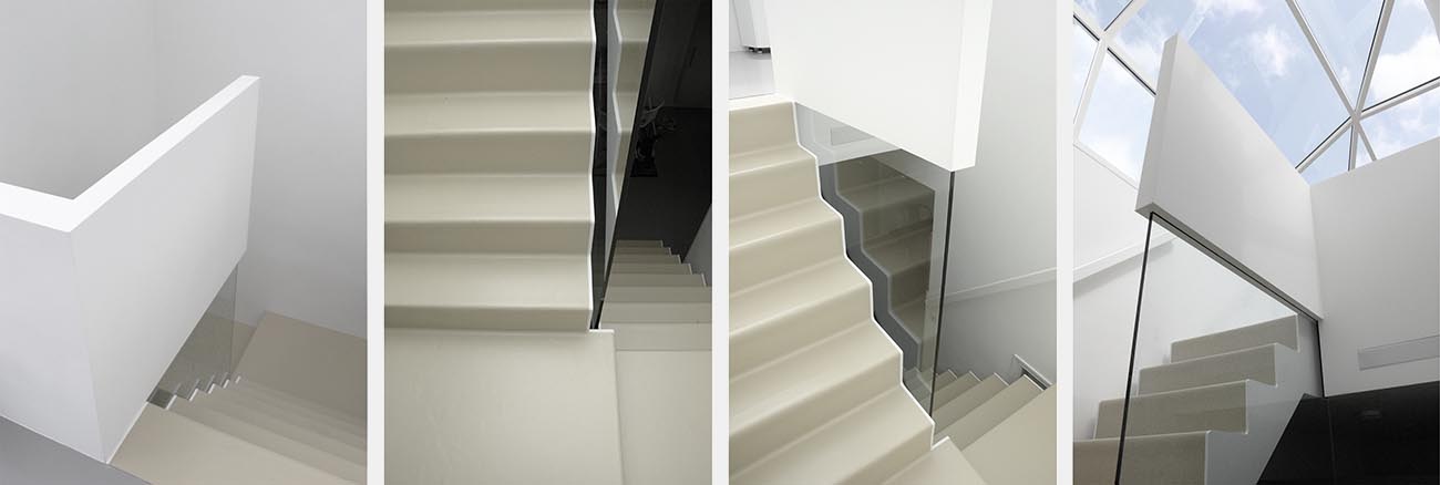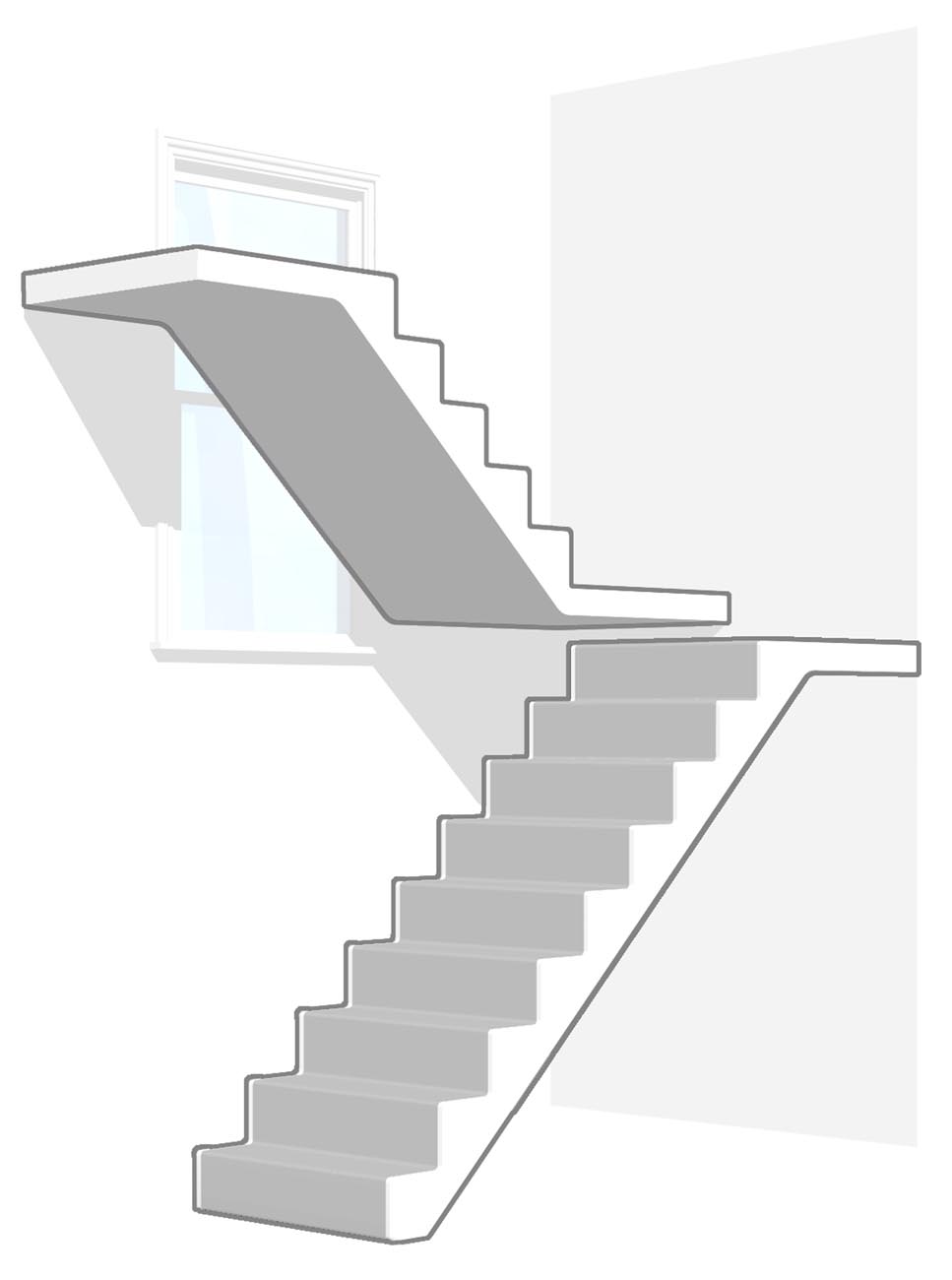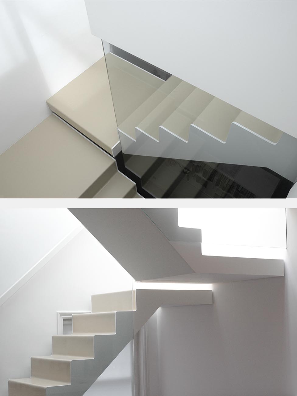 The refurbishment of an apartment over three levels in a West London period mansion block. A replacement staircase was designed to link the main living space to the roof top conservatory and external terrace. The extruded forms of the new stair flights are clad in rubber and inserted into the existing void. They hover independent of one-another and are offset from the flank wall so as not to conflict with the existing traditional sash window.