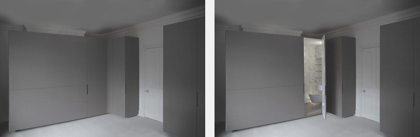 In the master bedroom the original features and volume of the room are preserved whilst the inserted architectural furniture conceals an en suite shower room and wardrobes.