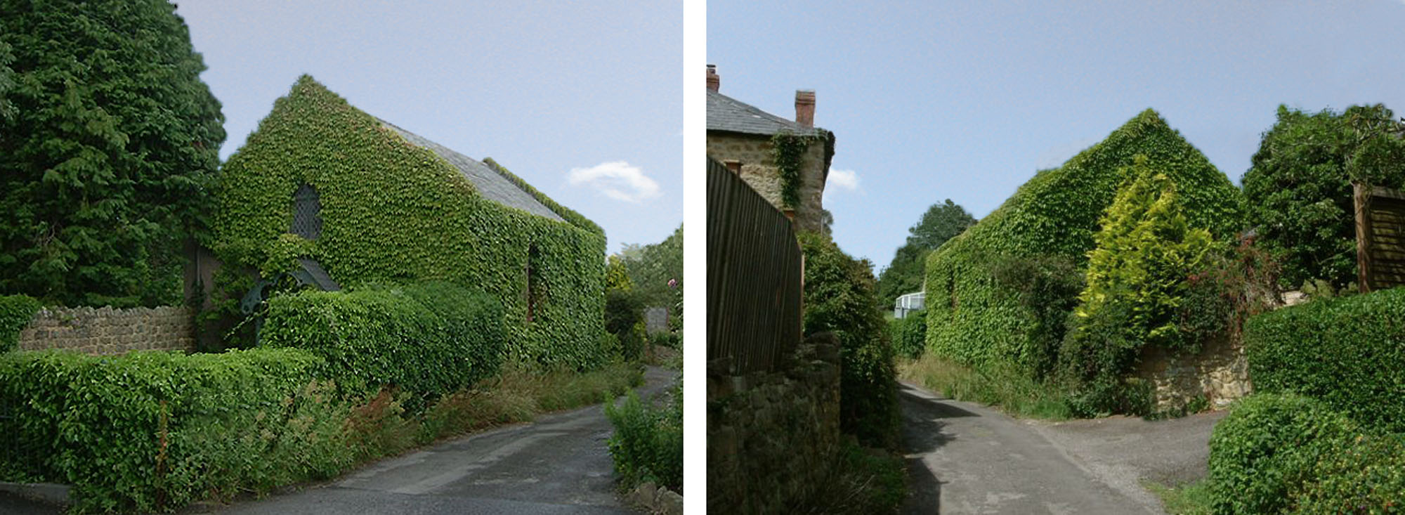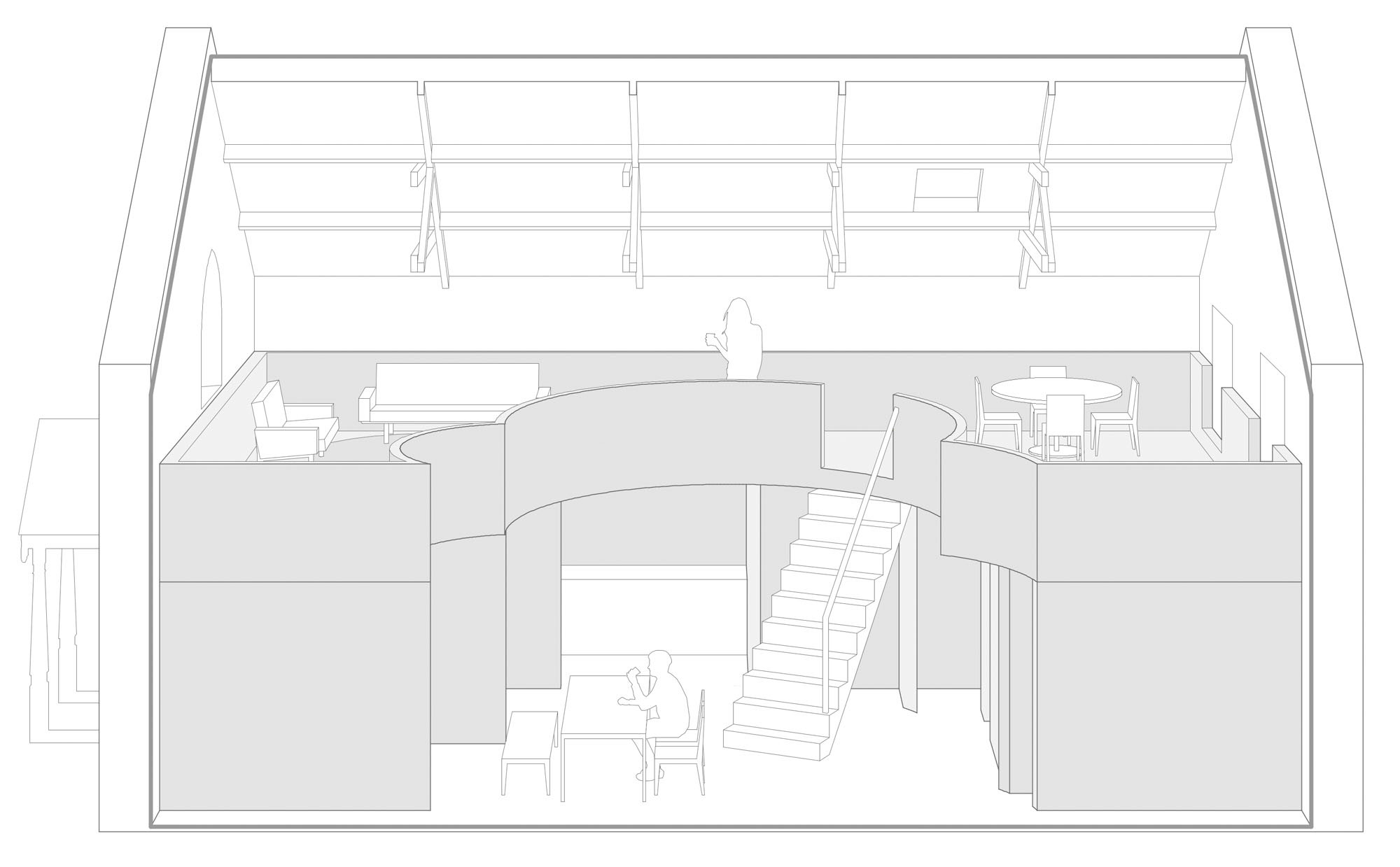 Cloaked in ivy, this modest chapel building has been converted from a book depository to a home. Entering at ground floor level there is a grid of load-bearing timber stud partitions attenuated to form a kitchen, utility, bedrooms and bathroom. Around the tall leaded west facing windows a clearing is formed and the full volume of the chapel opens up to an elevated open plan living deck.