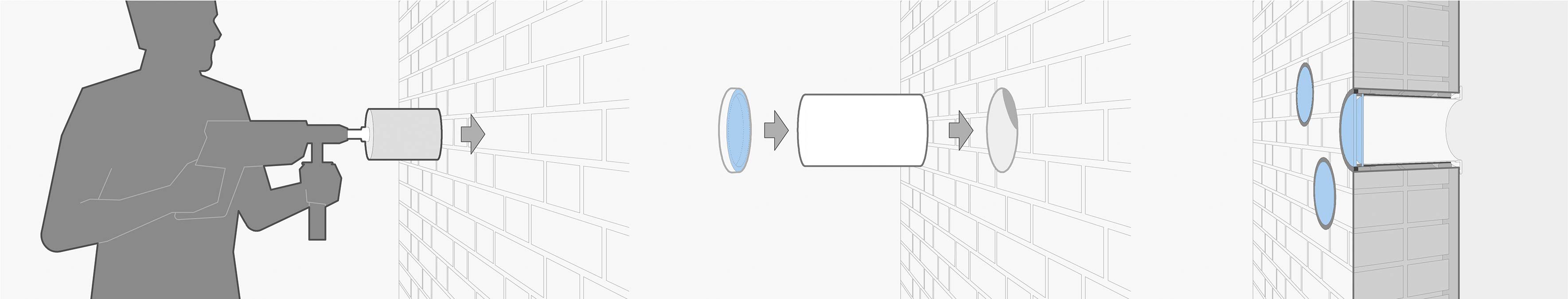 A proprietary product used to create a small circular opening in an existing wall structure. A 150mm diameter core hole is drilled to receive a sleeve that is cut to length to suit the wall thickness. A double glazed unit is fitted to be flush with the external face of the wall and the internal end of the liner can be plastered in or fitted with a trim.
