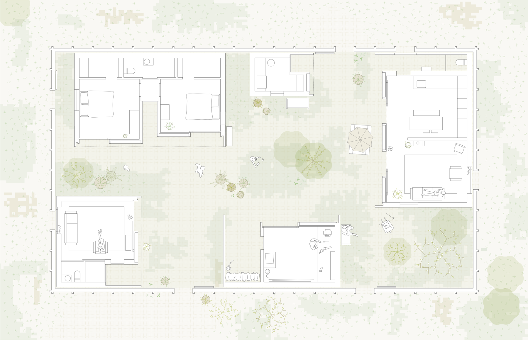 The house and garden are considered as one territory. The hierarchy of the formal house plan is reconfigured to circumscribe the garden, rather than the garden circumscribing the house.