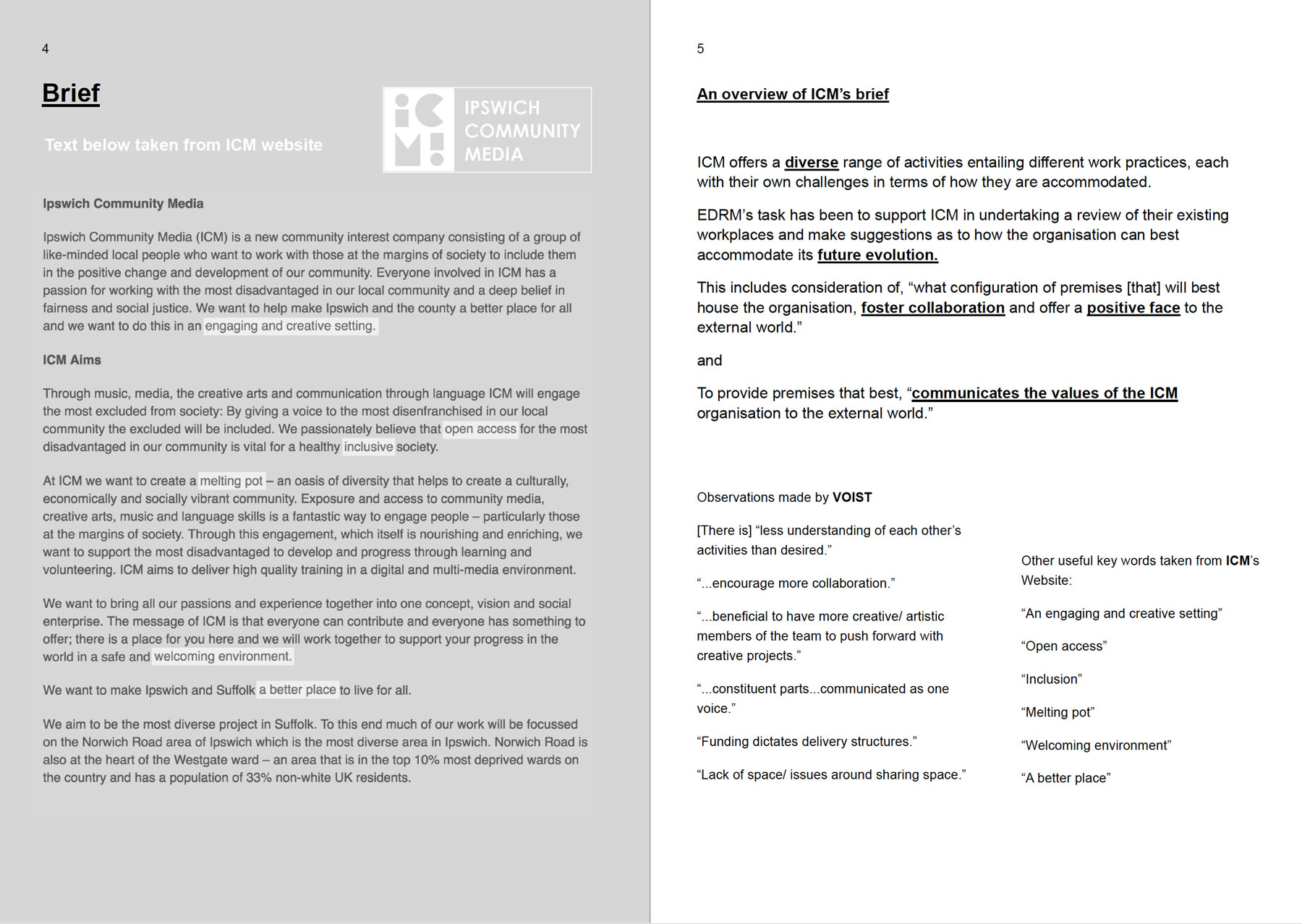 EDRM worked closely with ICM to help explore how their premises could enhance their organisation. ICM undertake a diverse range of activities entailing different work practices, each with its own challenges in terms of how they are accommodated. EDRM's task has been to support a review of their existing workplaces and make suggestions as to how the organisation can best accommodate its future evolution. This included consideration of the type of premises that would best house their activities, foster collaboration and offer a positive face to the external world, as well as to communicate the values of ICM. EDRM have hosted many workshops with ICM's community over the last few years and our fruitful collaboration has fostered a sense of ownership and pride in their new premises.
